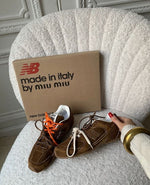 Designed in premium brown suede and technical mesh, this pair reinterprets a classic New Balance silhouette through Miu Miu’s refined, fashion-forward lens.